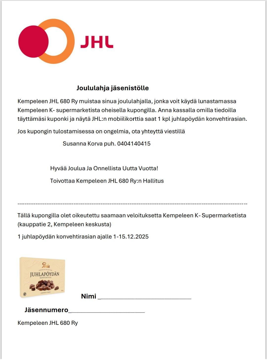 Kempeleen JHL:n hallitus haluaa muistaa jäsenistöä pienellä joululahjalla.
